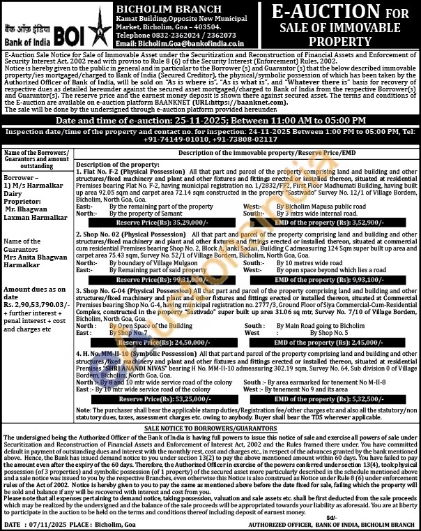 1. Flat No. F-2 (Physical Possession) All that part and parcel of the property comprising land and building and other structures/fixed machinery and plant and other fixtures and fittings erected or installed thereon, situated at residential Premises bearing Flat No. F-2, having municipal registration no. 1/2832/FF2, First Floor Madhumati Building, having built up area 92.05 sqm and carpet area 72.14 sqm constructed in the property "Sastivado" Survey No. 12/1 of Village Bordem, Bicholim, North Goa, Goa. East:- By the remaining part of the property North:- By the property of Samant West:- South: By Bicholim Mapusa public road By 3 mtrs wide internal road