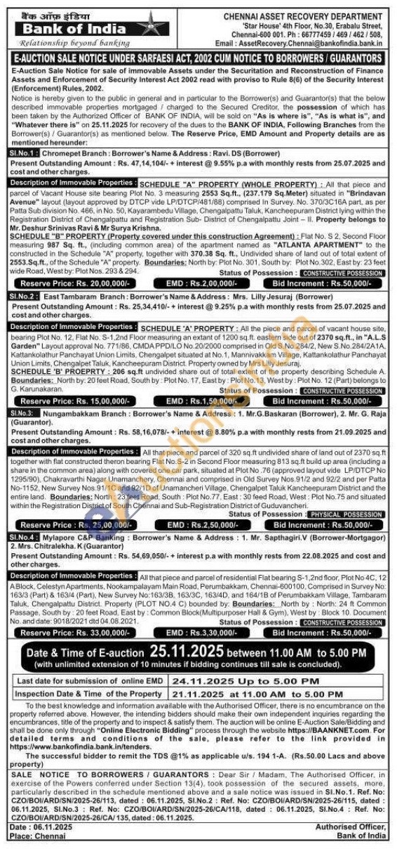 SCHEDULE "A" PROPERTY (WHOLE PROPERTY) All that piece and parcel of Vacant House site bearing Plot No. 3 measuring 2553 Sq.ft., (237.170 5Sq.Meter) situated in "Brindavan Avenue layout (layout approved by DTCP vide LPIDTCP/481/88) comprised in Survey. No. 370/3C16A part, as por Patta Sub division No. 466, in No. 50, Kayarambedu Village, Chengalpattu Taluk, Kancheepuram District lying within the Registration District of Chengalpattu and Registration Sub-District of Chengalpattu Joint Property belongs to Mr. Deshur Srinivas Ravi & Mr Surya Krishna. SCHEDULE "B" PROPERTY (Property covered under this construction Agreement): Flat No. 52. Second Floor measuring 987 Sq. ft., (including common area) of the apartment named as "ATLANTA APARTMENT" to the constructed in the Schedule "A" property, together with 370.38 Sq. ft., Undivided share of land out of total edent of 2553.Sq.ft., of the Schedule "A" property. Boundaries: North by: Plot No. 301, South by Plot No 302, East by: 23 feet wide Road, West by: Plot Nos 2938294