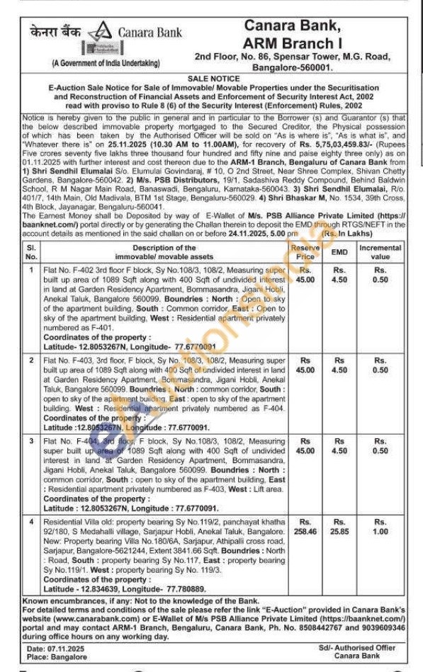4) Residential Villa old: property bearing Sy No. 119/2, panchayat khatha 92/180, S Medahalli village, Sarjapur Hobli, Anekal Taluk, Bangalore. New: Property bearing Villa No. 180/6A, Sarjapur, Athipalli cross road, Sarjapur, Bangalore-5621244, Extent 3841.66 Sqft. Boundries: North Road, South: property bearing Sy No.117, East: property bearing Sy No. 119/1. West: property bearing Sy No. 119/3. Coordinates of the property: