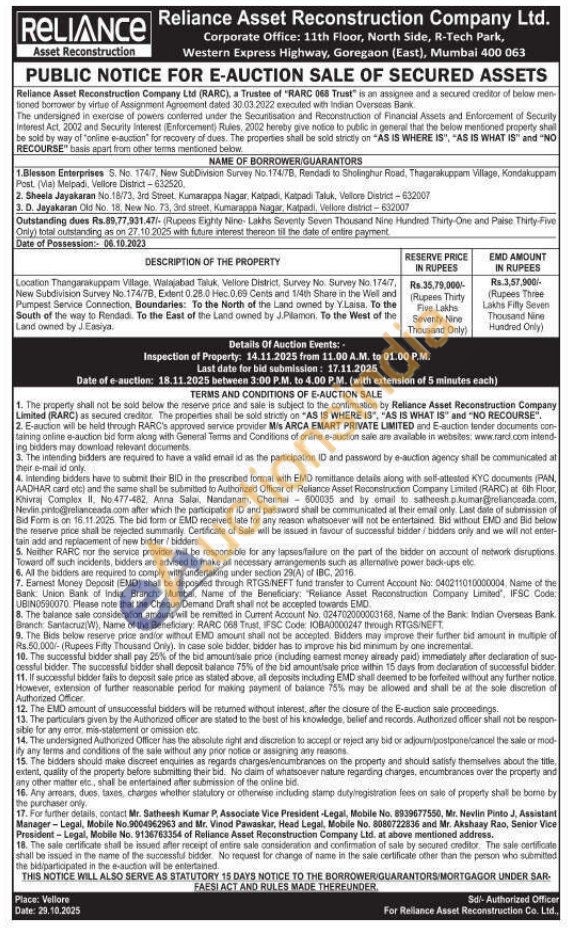 Location Thangarakuppam Village, Walajabad Taluk, Vellore District, Survey No. Survey No. 174/7, New Subdivision Survey No. 174/7B, Extent 0.28.0 Hec.0.69 Cents and 1/4th Share in the Well and Pumpest Service Connection, Boundaries: To the North of the Land owned by Y.Laisa. To the South of the way to Rendadi. To the East of the Land owned by J.Pilamon. To the West of the Land owned by J. Easiya.