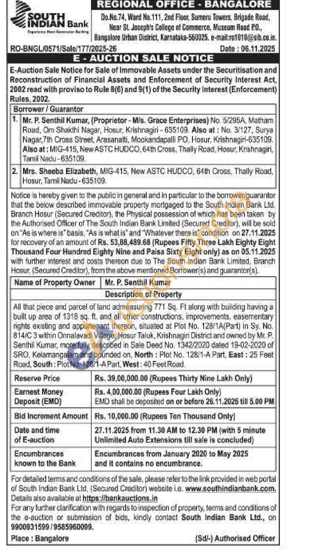 All that piece and parcel of land admeasuring 771 Sq. Ft along with building having a built up area of 1318 sq. ft. and all other constructions, improvements, easementary rights existing and appurtenant thereon, situated at Plot No. 128/1A(Part) in Sy. No. 814/C 3 within Onnalavadi Village, Hosur Taluk, Krishnagiri District and owned by Mr. P. Senthil Kumar, more fully described in Sale Deed No. 1342/2020 dated 19-02-2020 of SRO, Kelamangalam and bounded on, North: Plot No. 128/1-A Part, East: 25 Feet Road, South: Plot No. 128/1-A Part, West: 40 Feet Road.