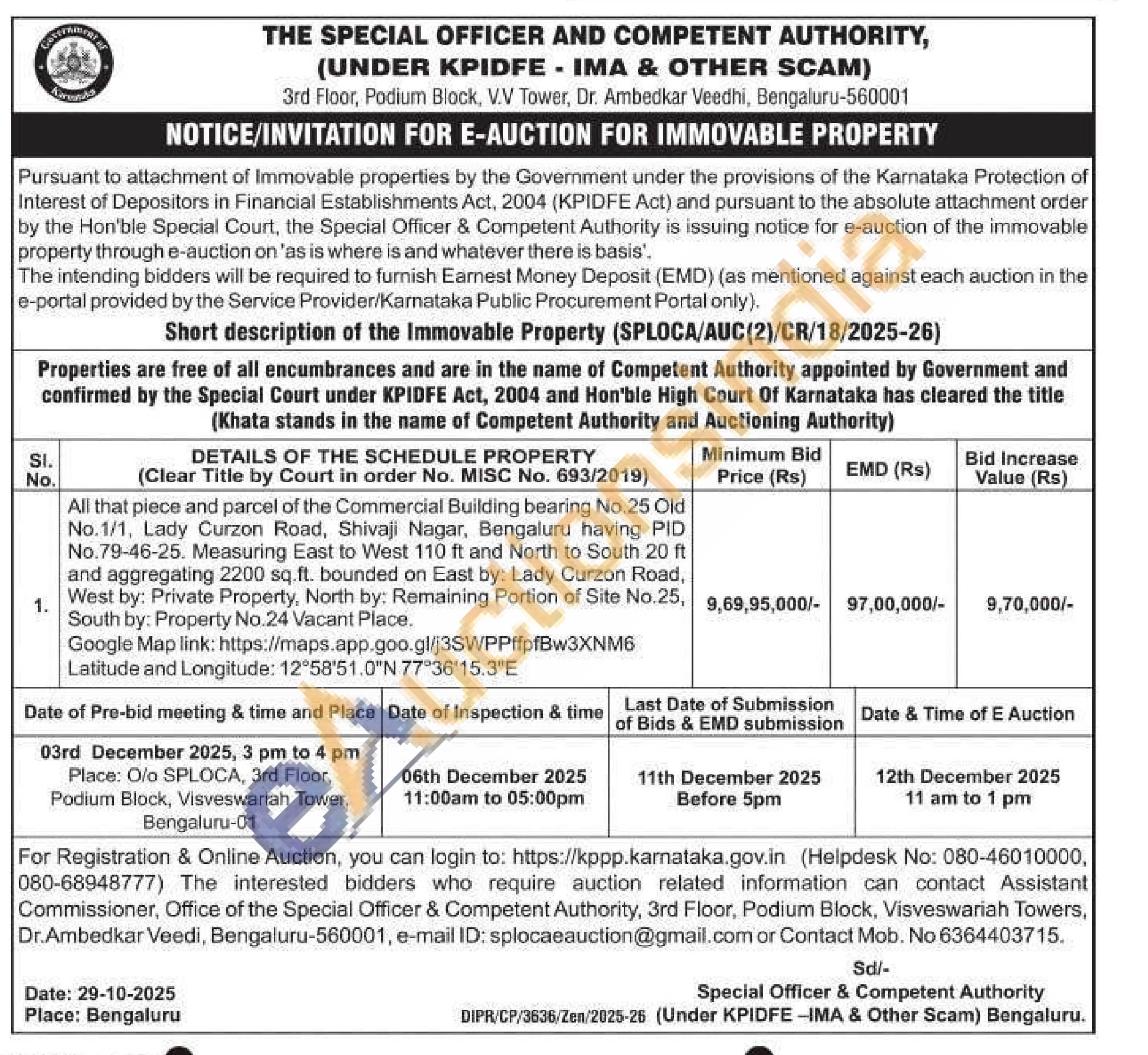 All that piece and parcel of the Commercial Building bearing No.25 Old No.1/1, Lady Curzon Road, Shivaji Nagar, Bengaluru having PID No.79-46-25. Measuring East to West 110 ft and North to South 20 ft and aggregating 2200 sq.ft. bounded on East by: Lady Curzon Road, West by: Private Property, North by: Remaining Portion of Site No.25, South by: Property No.24 Vacant Place.
