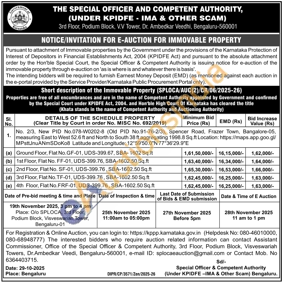 No. 2/3, New PID No.078-W0202-8 (Old PID No.91-76-2/3), Spencer Road, Frazer Town, Bangalore-05, measuring East to West 52.6 ft and North to South 38 ft aggregating 1998.8 Sq.ft Location: https://maps.app.goo.gl/MPsttJnuANmSDoKo8 Latitude and Longitude: 12°59'50.0″N 77°36'29.9"E