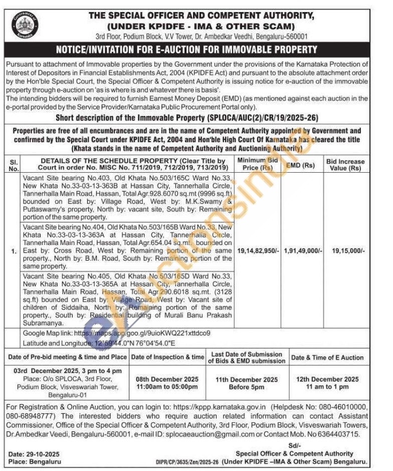 Vacant Site bearing No.403, Old Khata No.503/165C Ward No.33, New Khata No.33-03-13-363B at Hassan City, Tannerhalla Circle, Tannerhalla Main Road, Hassan, Total Agr.928.6070 sq.mt (9996 sq.ft) bounded on East by: Village Road, West by: M.K.Swamy & Puttaswamy's property, North by: vacant site, South by: Remaining portion of the same property.Vacant Site bearing No.404, Old Khata No.503/165B Ward No.33, New Khata No.33-03-13-363A at Hassan City, Tannerhalla Circle, Tannerhalla Main Road, Hassan, Total Agr.654.04 sq.mt. bounded on East by: Cross Road, West by: Remaining portion of the same property., North by: B.M. Road, South by: Remaining portion of the same property. Vacant Site bearing No.405, Old Khata No.503/165D Ward No.33, New Khata No.33-03-13-365A at Hassan City, Tannerhalla Circle, Tannerhalla Main Road, Hassan, Total Agr.290.6018 sq.mt. (3128 sq.ft) bounded on East by: Village Road, West by: Vacant site of children of Siddaiha, North by: Remaining portion of the same property., South by: Residential building of Murali Banu Prakash Subramanya.