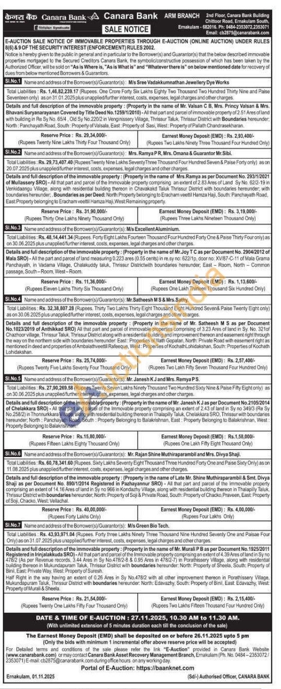 5) All that part and parcel of the Immovable property comprising an extent of 2.43 of land in Sy no 349/3 (Re Sy No.258/2) in Thonnurkkara Village, along with residential building thereon in Thalapilly Taluk, Chelakkara SRO, Thrissur with boundaries hereunder; North: Panchayath Road, South: Property Belonging to Balakrishnan, East: Property Belonging to Balakrishnan, West Property Belonging to Balakrishnan.
