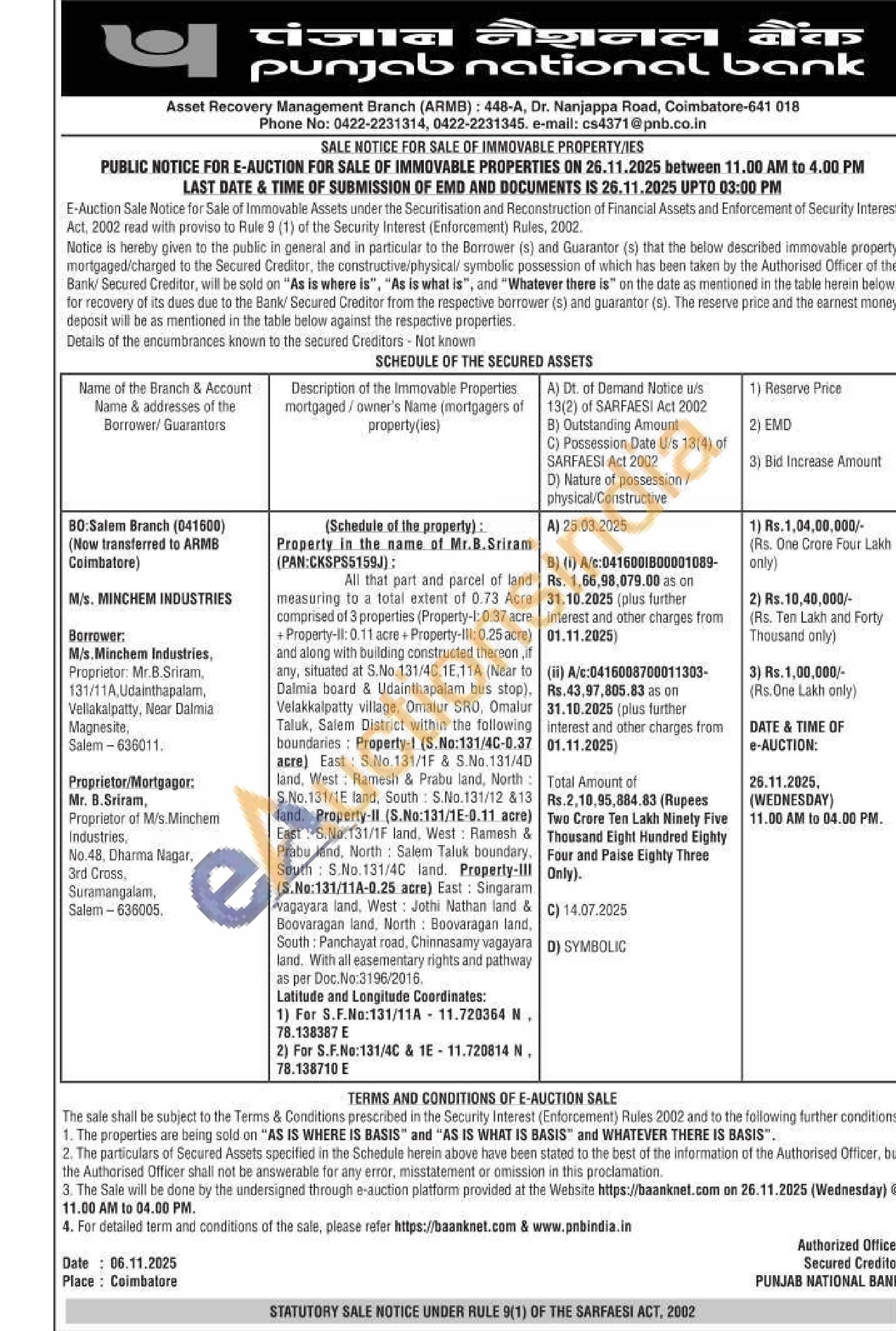 All that part and parcel of land measuring to a total extent of 0.73 Acre comprised of 3 properties (Property-1: 0.37 acre +Property-II: 0.11 acre + Property-III: 0.25 acre) and along with building constructed thereon if any, situated at S.No. 131/4C1E.11A (Near to Dalmia board & Udainthapalam bus stop). Velakkalpatty village. Omalur SRO, Omalur Taluk, Salem District within the following boundaries: Property-1 (S.No:131/4C-0.37 acre) East: S.No. 131/1F & S.No. 131/40 land, West: Ramesh & Prabu land, North S.No.131/1E land, South S.No.131/12 &13 land. Property-II (S.No:131/1E-0.11 acre) East: S.No. 131/1F land, West: Ramesh & Prabu land, North: Salem Taluk boundary. South S.No. 131/40 land. Property-III (S.No:131/11A-0.25 acre) East: Singaram vagayara land. West: Jothi Nathan land & Boovaragan land, North Boovaragan land, South: Panchayat road, Chinnasamy vagayara land. With all easementary rights and pathway as per Doc. No:3196/2016.