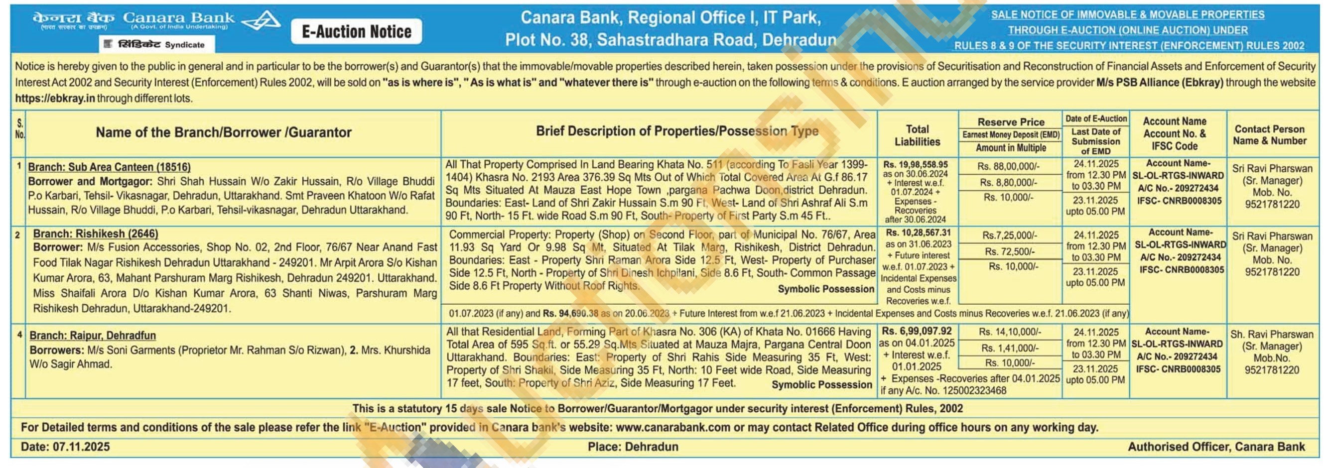 2) Commercial Property: Property (Shop) on Second Floor, part of Municipal No. 76/67, Area 11.93 Sq Yard Or 9.98 Sq Mt, Situated At Tilak Marg, Rishikesh, District Dehradun. Boundaries: East Property Shri Raman Arora Side 12.5 Ft, West- Property of Purchaser Side 12.5 Ft, North - Property of Shri Dinesh Ichpilani, Side 8.6 Ft, South- Common Passage Side 8.6 Ft Property Without Roof Rights.