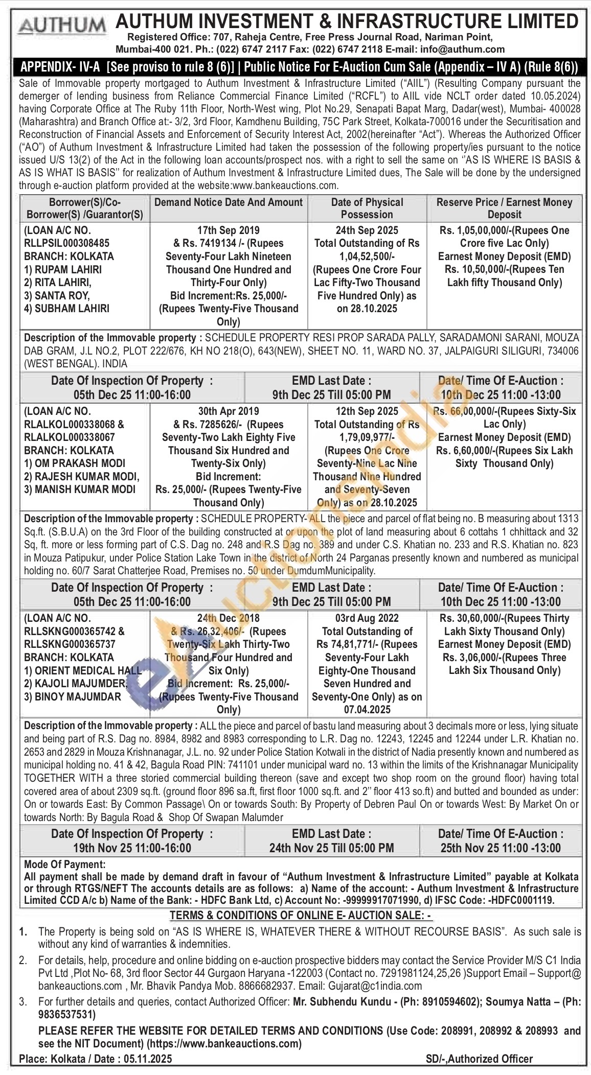 ALL the piece and parcel of bastu land measuring about 3 decimals more or less, lying situate and being part of R.S. Dag no. 8984, 8982 and 8983 corresponding to L.R. Dag no. 12243, 12245 and 12244 under L.R. Khatian no. 2653 and 2829 in Mouza Krishnanagar, J.L. no. 92 under Police Station Kotwali in the district of Nadia presently known and numbered as municipal holding no. 41 & 42, Bagula Road PIN: 741101 under municipal ward no. 13 within the limits of the Krishnanagar Municipality TOGETHER WITH a three storied commercial building thereon (save and except two shop room on the ground floor) having total covered area of about 2309 sq.ft. (ground floor 896 sa.ft, first floor 1000 sq.ft. and 2" floor 413 so.ft) and butted and bounded as under: On or towards East: By Common Passage On or towards South: By Property of Debren Paul On or towards West: By Market On or towards North: By Bagula Road & Shop Of Swapan Malumder