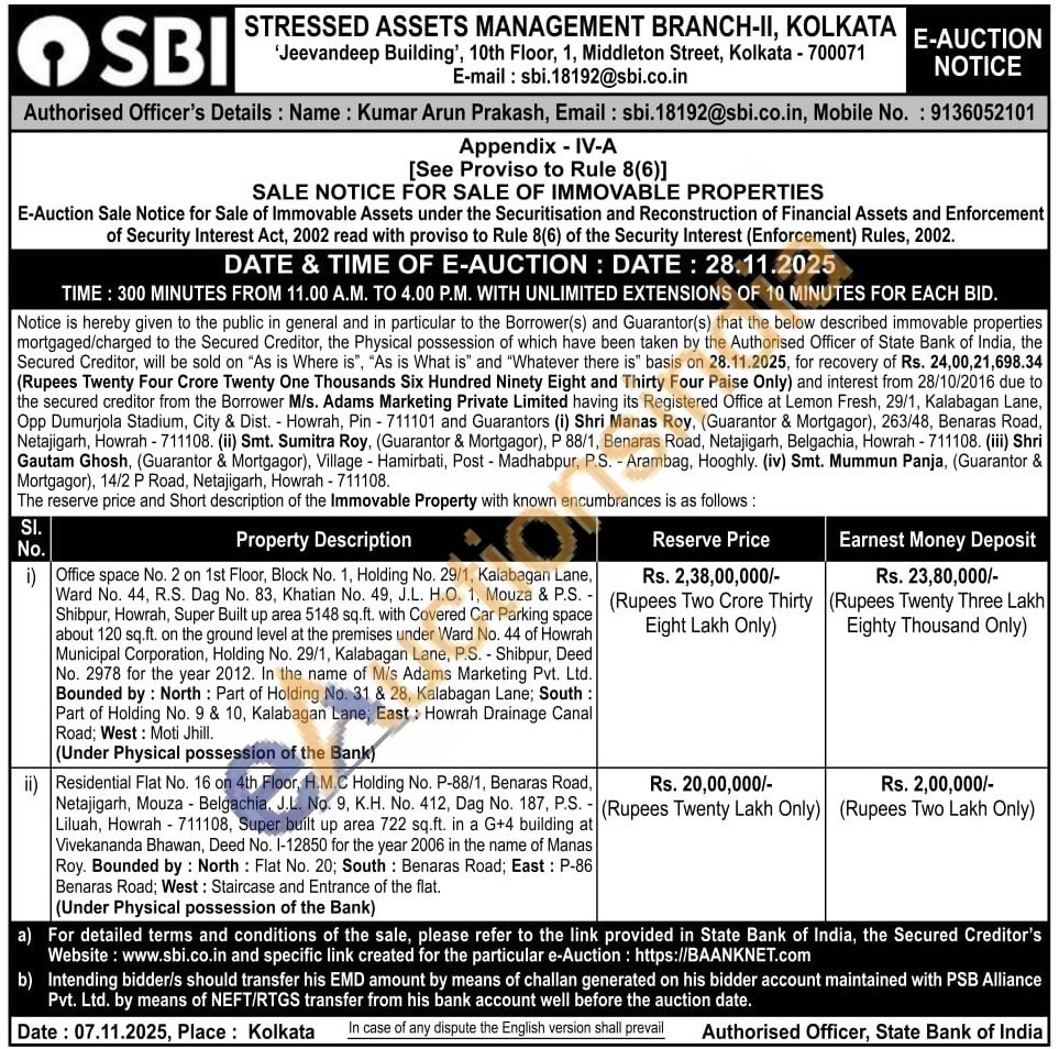Office space No. 2 on 1st Floor, Block No. 1, Holding No. 29/1, Kalabagan Lane, Ward No. 44, R.S. Dag No. 83, Khatian No. 49, J.L. H.O. 1, Mouza & P.S. Shibpur, Howrah, Super Built up area 5148 sq.ft. with Covered Car Parking space about 120 sq.ft. on the ground level at the premises under Ward No. 44 of Howrah Municipal Corporation, Holding No. 29/1, Kalabagan Lane, P.S. - Shibpur, Deed No. 2978 for the year 2012. In the name of M/s Adams Marketing Pvt. Ltd. Bounded by: North: Part of Holding No. 31 & 28, Kalabagan Lane; South: Part of Holding No. 9 & 10, Kalabagan Lane; East: Howrah Drainage Canal Road: West: Moti Jhill