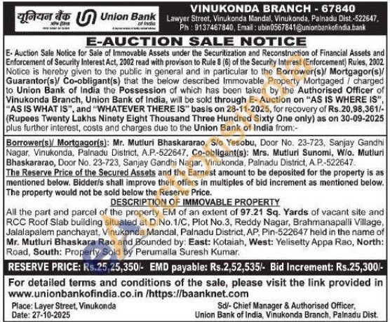 All the part and parcel of the property EM of an extent of 97.21 Sq. Yards of vacant site and RCC Roof Slab building situated at D.No.1/C, Plot No.3, Reddy Nagar, Brahmanapalli Village, Jalalapalem panchayat, Vinukonda Mandal, Palnadu District, AP, Pin-522647 held in the name of Mr. Mutluri Bhaskara Rao and Bounded by: East: Kotaiah, West: Yelisetty Appa Rao, North: Road, South: Property Sold by Perumalla Suresh Kumar.