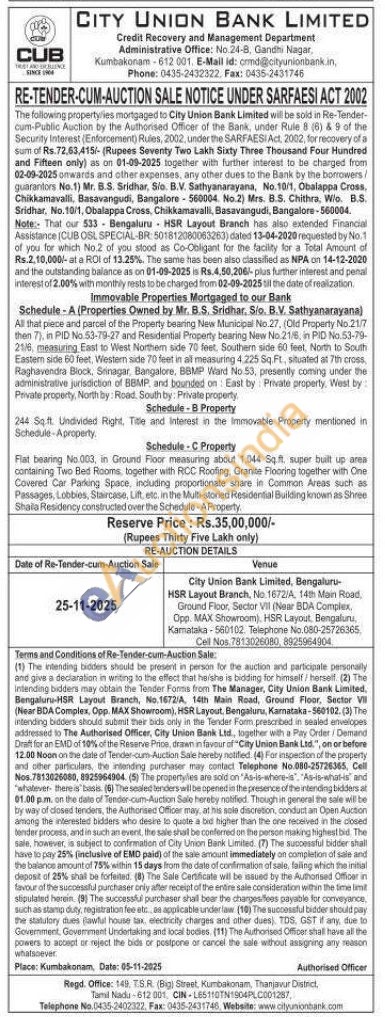 Schedule-A (Properties Owned by Mr. B.S, Sridhar, Sio. B.V. Sathyanarayanal All that piece and parcel of the Property bearing New Municipal No. 27, (Old Property No.21/7 then 7), in PID No.53-79-27 and Residential Property bearing New No.218 in PID No.53-79-216 measuring East to West Northern side 70 feet, Southern side 60 feet, North to South Eastem side 60 feet. Western side 70 feet in all measuring 4,225 Sq. Ft, situated at 7th cross, Raghavendra Block, Srinagar, Bangalore, BBMP Ward No.53, presently coming under the atrtinistrative jurisdiction of BBMP, and bounded on East by Private property, West by: Private property, North by: Road, South by: Private property Schedule-B Property 244 Sq.ft. Undivided Right, Title and Interest in the immovable Property mentioned in Schedule-Aproperty Schedule-C Property Flat bearing No. 003, in Ground Floor measuring about 1544 Sq.ft. super built up ares containing Two Bed Rooms, together with RCC Roofing, Granite Flooring together with One Covered Car Parking Space, including proportionate share in Common Areas such as Passages, Lobbies, Staircase, Lift, etc, in the Multi-storied Residential Building known as Shree Shala Residency constructed over the Schedule-A Property