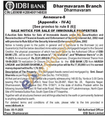 All that part and piece of Residential site property admeasuring 148.83 Sq. Yards or 3.00 Cents bearing Plot No:5, Sy. No: 494-3, Near Door No.28-897, Ward No. 28, Rajendra Nagar, Dharmavaram, Sri Sathyasai Dist. PIN 515671, in the state of Andhra Pradesh within the following boundaries: East:18 Feet wide Road; West House of P Lakshminaraya, North: Open Site of N Venkata Subba Rao: South: Open Site of TVasantha