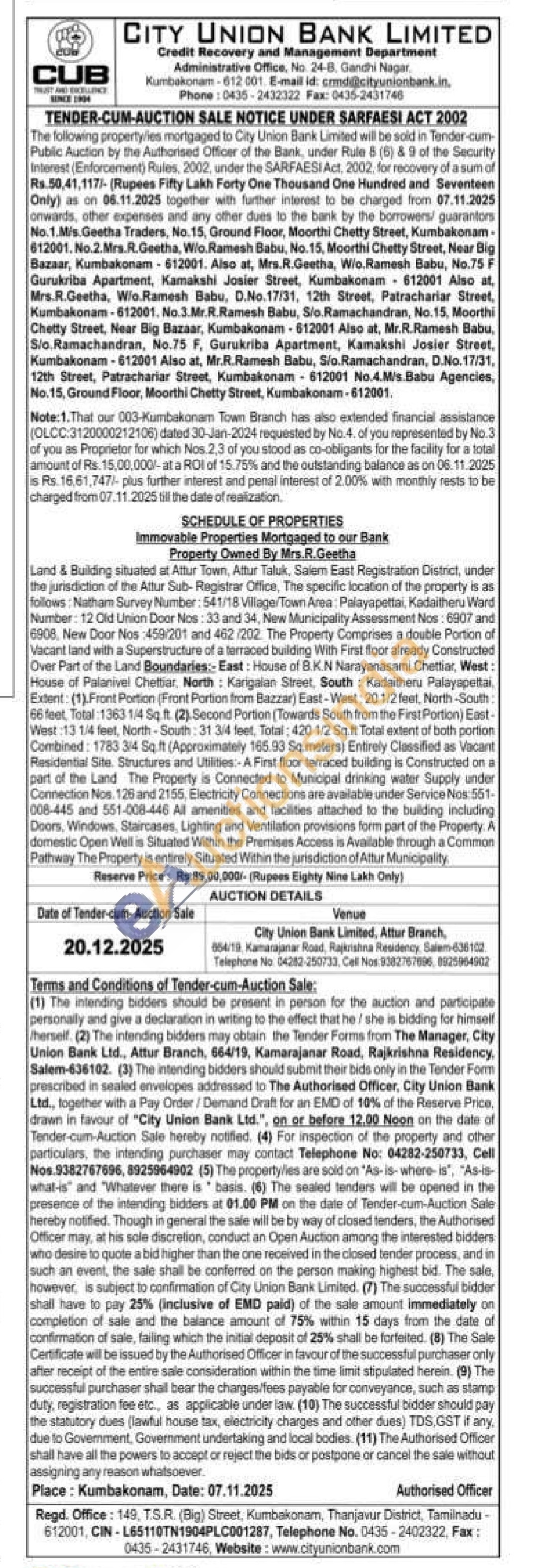 Land & Building situated at Attur Town, Artur Taluk, Salem East Registration District, under the jurisdiction of the Attur Sub-Registrar Office, The specific location of the property is as follows: Natham Survey Number: 541/18 Village/Town Area: Palayapettai, Kadaitheru Ward Number: 12 Old Union Door Nos: 33 and 34, New Municipality Assessment Nos: 6907 and 6906, New Door Nos 459/201 and 462/202. The Property Comprises a double Portion of Vacant land with a Superstructure of a terraced building With First foor already Constructed Over Part of the Land Boundaries:- East: House of B.K.N Narayanasami Chettiar, West: House of Palanivel Chettiar, North Karigalan Street, South: Kadaitheru Palayapettal, Extent: (1). Front Portion (Front Portion from Bazzar) East-West, 20 1/2 feet, North-South: 66 feet, Total:1363 1/4 Sq ft. (2) Second Portion (Towards South from the First Portion) East-West :13 1/4 feet, North-South: 31 34 feet. Total: 420 1/2 Sq.ft Total extent of both portion Combined, 1783 3/4 Sq.ft (Approximately 165.93 Sq. meters) Entirely Classified as Vacant Residential Site. Structures and Utilities: A First floor terraced building is Constructed on a part of the Land The Property is Connected to Municipal drinking water Supply under Connection Nos. 126 and 2155, Electricity Connections are available under Service Nos: 551-008-445 and 551-008-446 All amenities and facilities attached to the building including Doors, Windows, Staircases, Lighting and Ventilation provisions form part of the Property A domestic Open Wells Situated Within the Premises Access is Available through a Common Pathway The Property is entirely Situated Within the jurisdiction of Attur Municipality