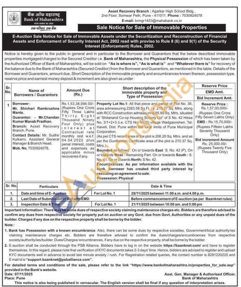 All that piece and parcel of Plot No. 36, area admeasuring 2263.58 Sq.Ft. i.e. 210.37 Sq. Mtrs. along with RCC Construction admeasuring 85.89 Sq. Mtrs. situated at "Shilanand Co-op Housing Society Ltd" of S No. 42 Hissa No. 3/1+2+3 (i.e. CTS No. 4529) village Wadgaonsheri, Tal: Haveli, Dist: Pune within the local limits of Pune Municipal Corporation.