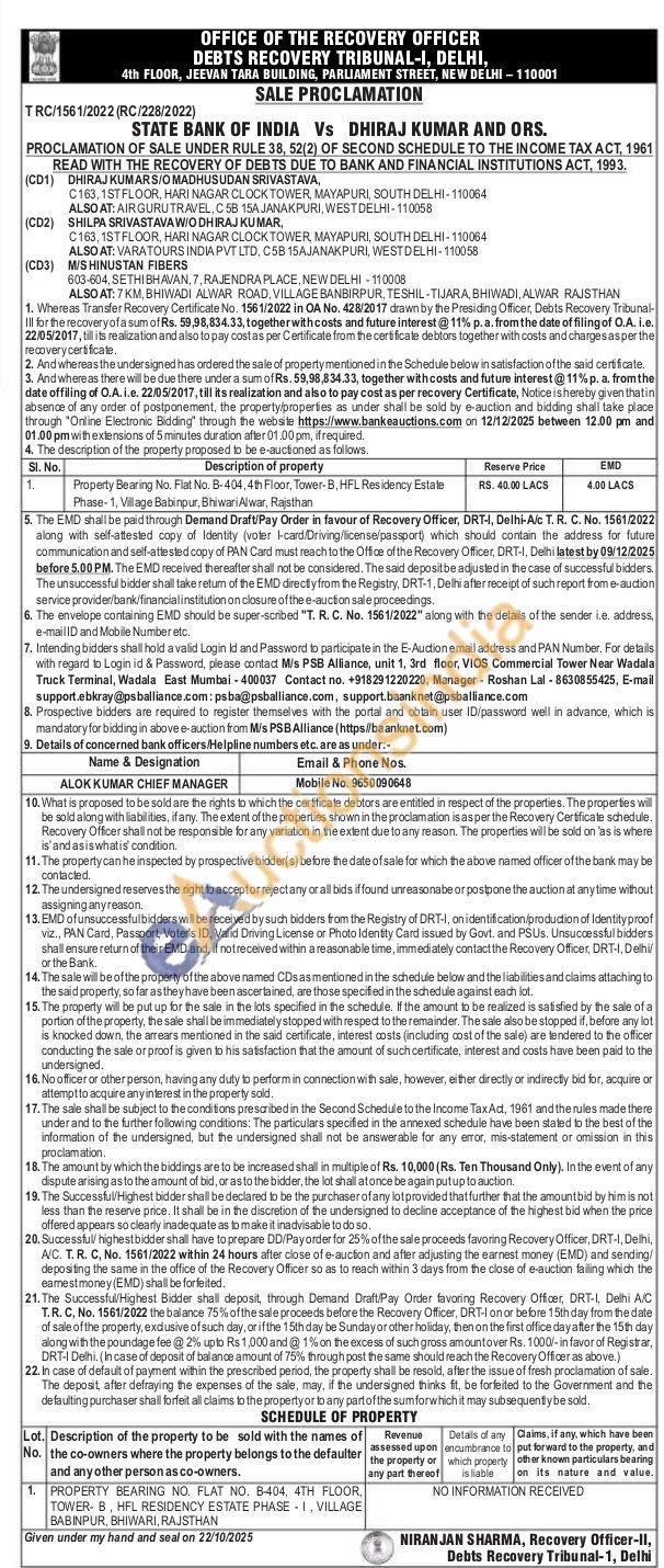 Property Bearing No. Flat No . 8-404,4th Floor, Tower-B. HPL Residency Estate Phase-1, Village Babinpur BhiwariAlwar. Rajsthan
