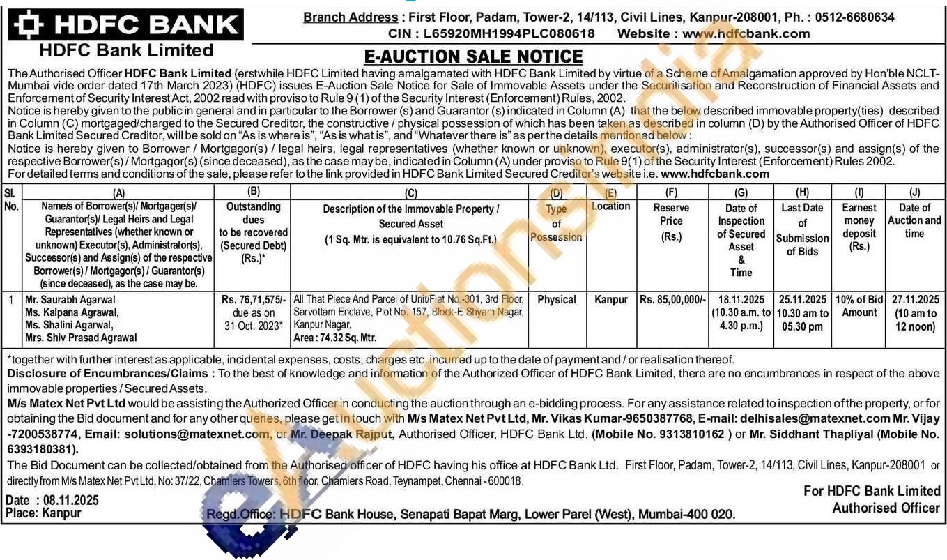 All that piece and Parcel of Unit/Flat No.-301, 3rd Floor, Sanotham Enclave Plot No. 157, Block-E Shyam Nagar, Kanpur Nagar, Area: 74.32 Sq. Mtr.