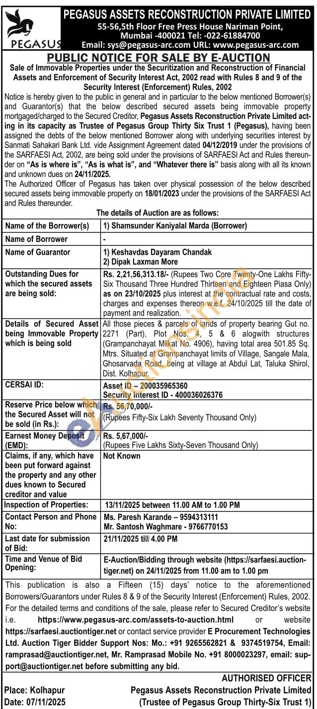 All those pieces & parcels of lands of property bearing Gut no. 2271 (Part), Plot Nos. 4, 5 & 6 alogwith structures (Grampanchayat Milkat No. 4906), having total area 501.85 Sq. Mtrs. Situated at Grampanchayat limits of Village, Sangale Mala, Ghosarvada Road, being at village at Abdul Lat, Taluka Shirol, Dist. Kolhapur.