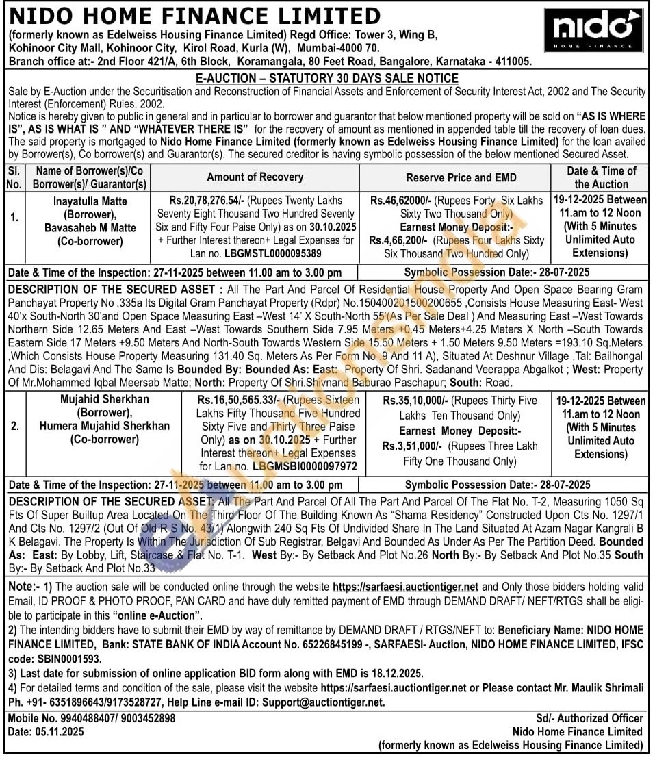 DESCRIPTION OF THE SECURED ASSET: All The Part And Parcel Of All The Part And Parcel Of The Flat No. T-2, Measuring 1050 Sq Fts Of Super Builtup Area Located On The Third Floor Of The Building Known As "Shama Residency" Constructed Upon Cts No. 1297/1 And Cts No. 1297/2 (Out Of Old R S No. 43/1) Alongwith 240 Sq Fts Of Undivided Share In The Land Situated At Azam Nagar Kangrali B K Belagavi. The Property Is Within The Jurisdiction Of Sub Registrar, Belgavi And Bounded As Under As Per The Partition Deed. Bounded As: East: By Lobby, Lift, Staircase & Flat No. T-1. West By:- By Setback And Plot No.26 North By:- By Setback And Plot No.35 South By:- By Setback And Plot No.33