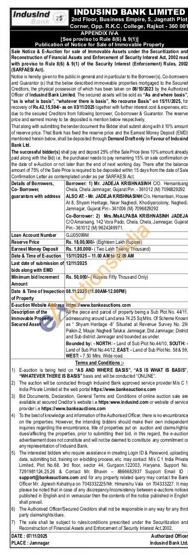 All the piece and parcel of property being a Sub Plot No. 44/11. admeasuring around Land area 74.25 SqMtrs. Of Scheme Knowr as Shyam Heritage -8 Situated at Revenue Survey No. 29/Palkin-2. Mouje. Naghed Taluka Jamnagar, Dist Jamnagar. District and Sub district Jamnagar and bounded as under.