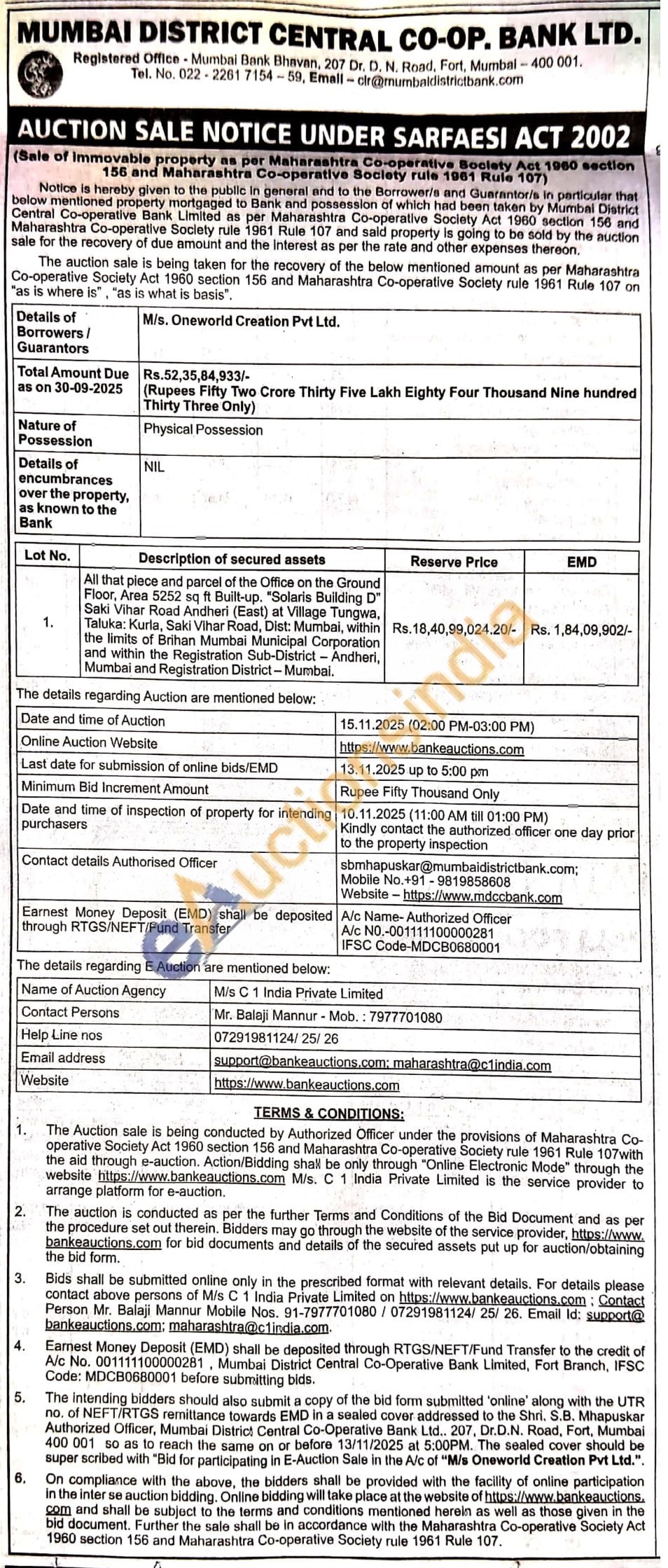 All that piece and parcel of the Office on the Ground Floor, Area 5252 sq ft Built-up. "Solaris Building D" Saki Vihar Road Andheri (East) at Village Tungwa, Taluka: Kurla, Saki Vihar Road, Dist: Mumbai, within the limits of Brihan Mumbai Municipal Corporation and within the Registration Sub-District - Andheri, Mumbai and Registration District-Mumbai