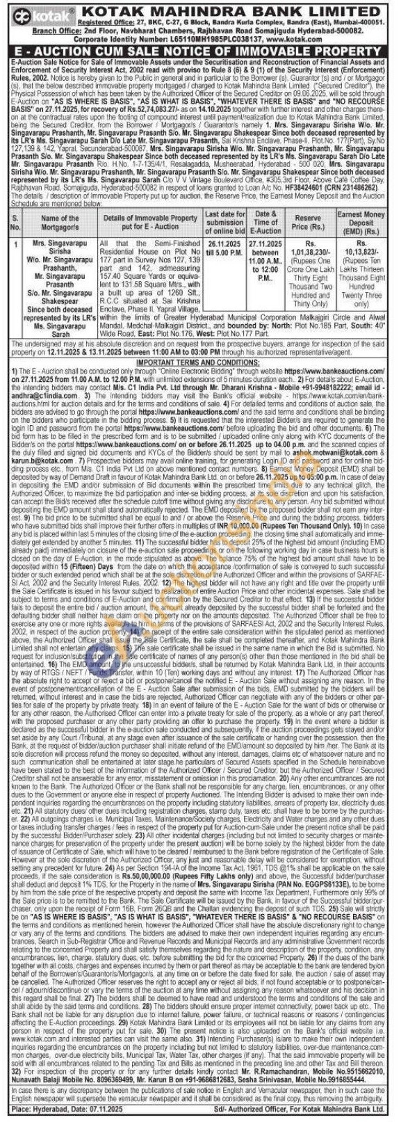 All that the Semi-Finished Residential House on Plot No 177 part in Survey Nos 127, 139 part and 142, admeasuring 157.40 Square Yards or equiva lent to 131.58 Square Mtrs., with a built up area of 1260 Sft., R.C.C situated at Sai Krishna Enclave, Phase II, Yapral Village, within the limits of Greater Hyderabad Municipal Corporation Malkajgiri Circle and Alwal Mandal, Medchal-Malkajgiri District,, and bounded by: North: Plot No. 185 Part, South: 40° Wide Road, East: Plot No. 176, West: Plot No.177 Part