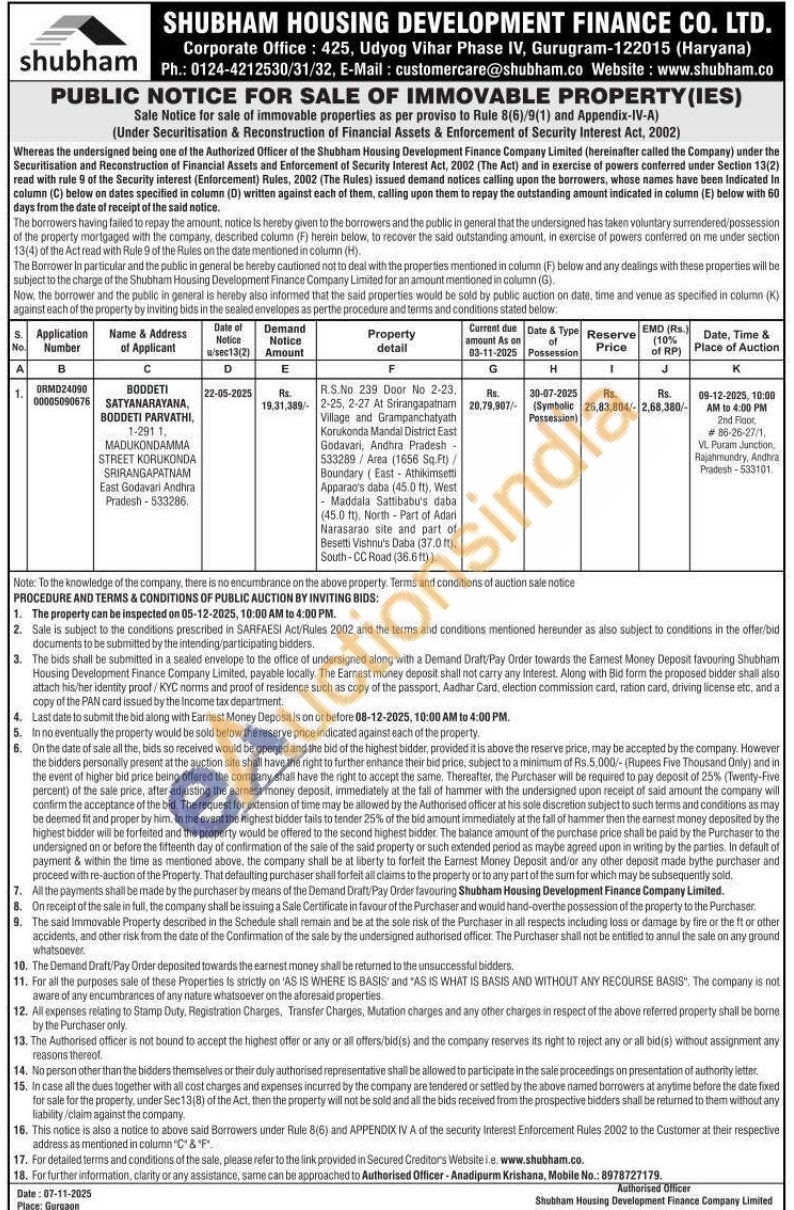 R.S.No 239 Door No 2-23. 2-25,2-27at srirangapatanam Village and Grampanchatyath Korukonda Mandal District East Godavari, Andhra Pradesh-533289/Area (1656 Sq.Ft)/Boundary East-Atmikomsetti Apparan's daba (45.0 ft), West Maddała Sattibabu's daba (45.0 ft), North-Part of Adari Narasaran site and part of Besetti Vishnur's Daba (37.0 ft), South-CC Road (36.6ft)).