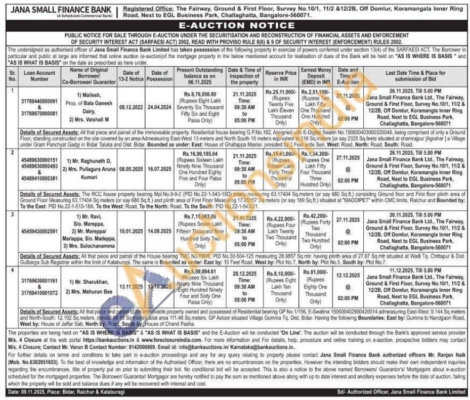 Details of Secured Assets: All that piece and parcel of the House bearing TMC No.190/6, PID No.30-504-125 measuring 28.9857 Sq.mtr. having plinth area of 27.87 Sq.mtr situated at Wadi Tq. Chittapur & Dist. Gulbarga Sub Registrar within the limit of Kalaburagi. The same is Bounded as under: East by: 10 Feet Road, West by: Plot No.7, North by: Plot No 5. South by: Plot No.7