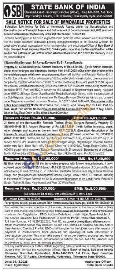 All that Part and Parcel of Flat No-501, in the fifth floor of Avalon Ridge, admeasuring 1062 sq feet of plinth area (including common area and car parking) together with undivided share of land admeasuring 43 square yards or 35.94 Square Meters out of total land admeasuring 882 Square Yards or 737.35 Square Meters being constructed on plot no B/2/2 (Part) and B2/3 in survey No-151, situated at Negeswarnagar colony, Kothapet under GHIMC LB Nagar Circle, Uppal Mandal, Medchal Malkajgiri District, within the jurisdiction of the Sub Registrar, Uppal, and in the name of Mr. Rangu Ravinder Slo Rangu Ramulu and covered under Registered sale deed Document Number 6051/2017 dated 12-05-2017.Boundaries of the Entire Apartment/Plot North: 30-0" wide road, South: Land Survey No-163, East: Plot No-82/4, West: Part of Plot No-B2/2, Boundaries of the Fiat No-501 North-Open to Sky, South Open to Sky, East-Open to Sky, West-Lift and Corridor,