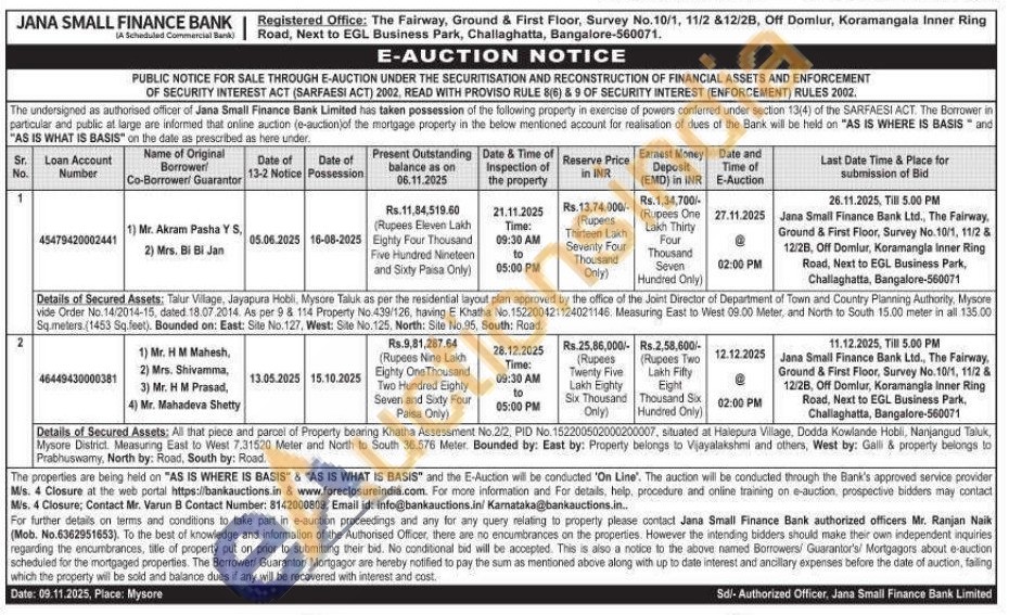 Details of Secured Assets: All that piece and parcel of Property bearing Khatha Assessment No.2/2, PID No. 152200502000200007, situated at Halepura Village, Dodda Kowlande Hobli, Nanjangud Taluk, Mysore District. Measuring East to West 7.31520 Meter and North to South 36.576 Meter. Bounded by: East by: Property belongs to Vijayalakshmi and others, West by: Galli & property belongs to Prabhuswamy, North by: Road, South by: Road.
