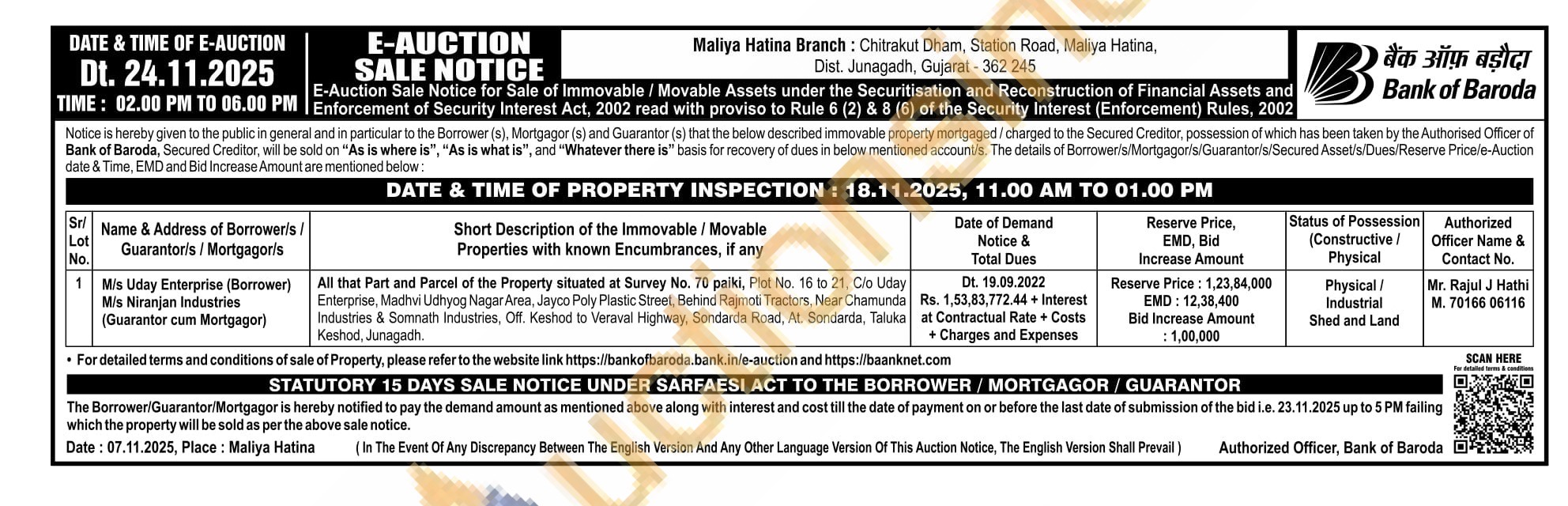 All that Part and Parcel of the Property situated at Survey No. 70 paiki, Plot No. 16 to 21, Cro Uday Enterprise. Madhvi Udhyog Nagar Area, Jayco Poly Plastic Street. Behind Rajmoti Tractors, Near Chamunda Industries & Somnath Industries, Off. Keshod to Veraval Highway, Sondarda Road, At. Sondarda, Taluka Keshod, Junagadh.