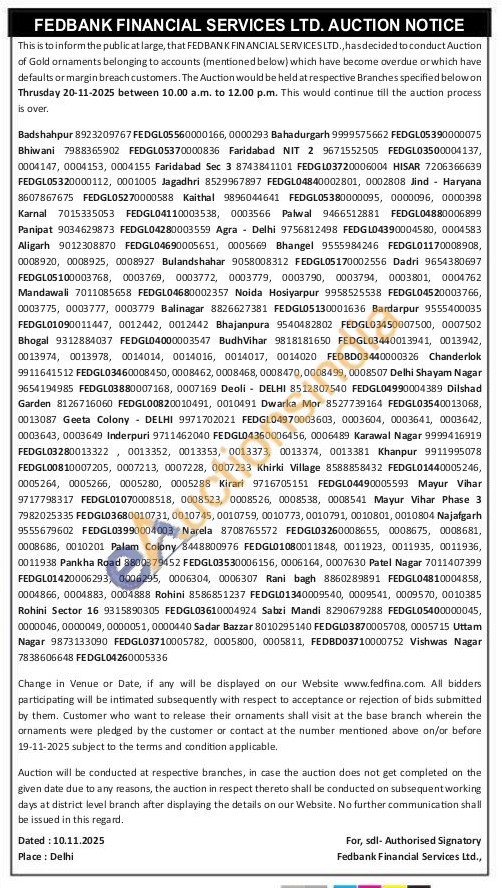 Fedbank Financial Services Ltd Gold Auctions Auction in New Delhi