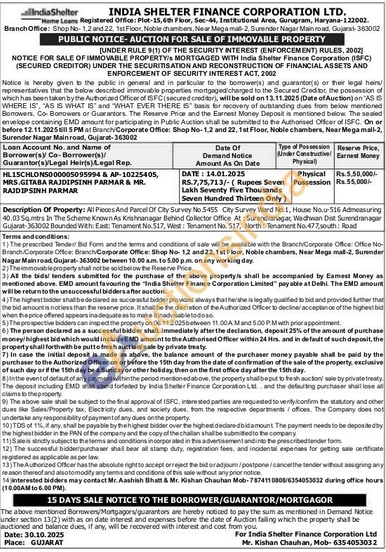 Description Of Property: All Pieces And Parcel Of City Survey No.5455 City Survey Ward No.1, House No.u-516 Admeasuring 40.03 Sq.mtrs In The Scheme Known As Krishnanagar Behind Collector Office At: Surendranagar, Wadhwan Dist Surendranagar Gujarat-363002 Bounded With: East: Tenament No.517, West: Tenament No. 517, North: Tenament No.477, south: Road