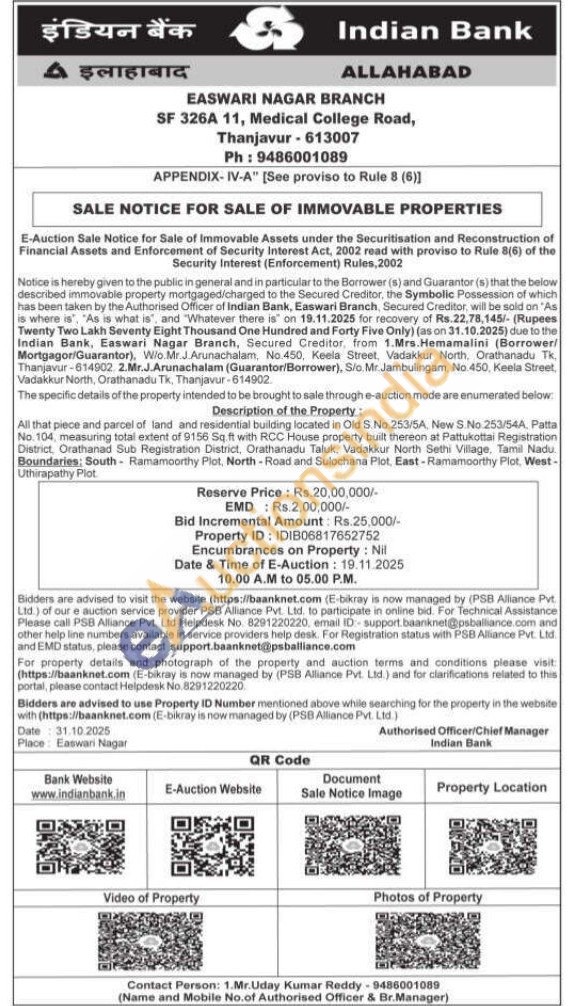 All that piece and parcel of land and residential building located in Old S.No.253/5A, New S.No. 253/54A, Patta No. 104, measuring total extent of 9156 Sq.ft with RCC House property built thereon at Pattukottai Registration District, Orathanad Sub Registration District, Orathanadu Taluk, Vadakkur North Sethi Village, Tamil Nadu. Boundaries; South Ramamoorthy Plot, North-Road and Sulochana Plot, East-Ramamoorthy Plot, West-Uthirapathy Plot