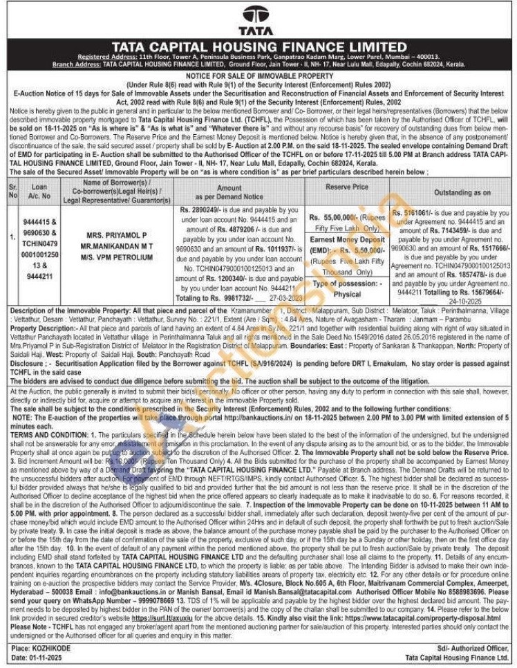 All that piece and parcel of the Kramanumber: 1, District: Malappuram, Sub District Vettathur, Desam: Vettathur, Panchayath: Vettathur, Survey No.: 221/1, Extent (Are/Sqm): 4.84 Ares, Nature of Avagasham-Tharam Janmam-Parambu Property Description:- All that piece and parcels of land having an extent of 4.84 Ares in Sy.No. 221/1 and together with residential building along with right of way situated in Vettathur Panchayath located in Vettathur village in Perinthalmanna Taluk and all rights mentioned in the Sale Deed No. 1549/2016 dated 26.05.2016 registered in the name of Mrs. Priyamol P in Sub-Registration District of Melatoor in the Registration District of Malappuram. Boundaries: East: Property of Sankaran & Thankappan, North: Property of Saidali Haji, West: Property of Saidali Haji, South: Panchayath Road