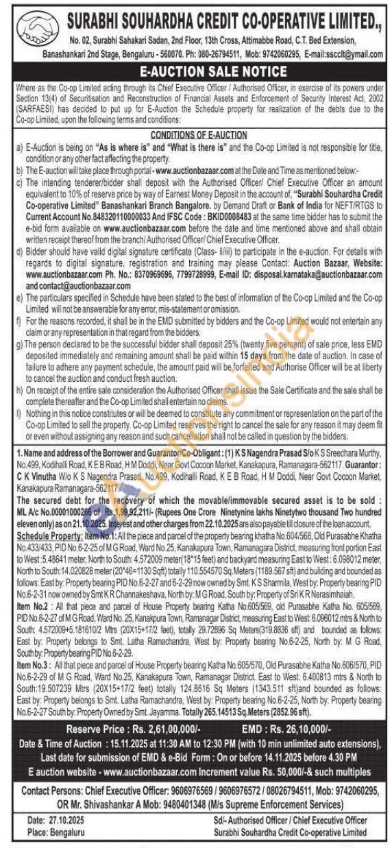 Schedule Property; Item No.1: All the piece and parcel of the property bearing khatha No.604/568, Old Purasabhe Khatha No. 433/433, PID No.6-2-25 of MG Road, Ward No. 25, Kanakapura Town, Ramanagara District, measuring front portion East to West 5.48641 meter, North to South: 4.572009 meter(18*15 feet) and backyard measuring East to West: 6.098012 meter, North to South: 14.020828 meter (20*46-1130 Sqft) totally 110.554570 Sq. Meters (1189.567 sit) and building and bounded as follows: East by: Property bearing PID No.6-2-27 and 6-2-29 now owned by Smt. KS Sharmila. West by: Property bearing PID No.6-2-31 now owned by Smt KR Channakeshava, North by: MG Road, South by: Property of SriK RNarasimhaiah. Item No.2: All that piece and parcel of House Property bearing Katha No.605/569, olid Purasabhe Katha No. 605/569, PID No.8-2-27 of M G Road, Ward No. 25. Kanakpura Town, Ramanagar District, measuring East to West: 6.096012 mtrs & North to South: 4.572009+5.1816102 Mts (20X15+17/2 feet), totally 29.72896 Sq Meters(319.8836 sft) and bounded as follows East by: Property belongs to Smt. Latha Ramachandra, West by: Property bearing No.6-2-25, North by: MG Road, Southby: Property bearing PID No.6-2-29. Item No.3: All that piece and parcel of House Property bearing Katha No.605/570, Old Purasabhe Katha No.606/570, PID No.6-2-29 of M G Road, Ward No.25, Kanakapura Town, Ramanagar District. East to West 6.400813 mtrs & North to South 19.507239 Mors (20X15+17/2 feet) totally 124.8516 Sq Meters (1343.511 sftjand bounded as follows: East by: Property belongs to Smt. Latha Ramachandra, West by: Property bearing No.6-2-25, North by: Property bearing No. 6-2-27 South by: Property Owned by Smt. Jayamma. Totally 265.14513 Sq. Meters (2852.96