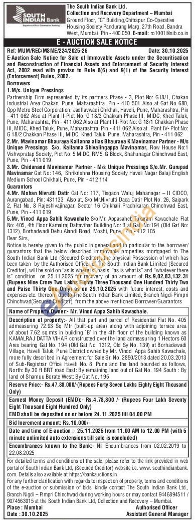 Description of property: All that part and parcel of Residential Flat No. 405 admeasuring 72.93 Sq Mtr (built-up area) along with adjoining terrace area of about 7.62 sq.mts in building 'B' in the 4th floor of the building known as KAMALRAJ DATTA VIHAR constructed over the land admeasuring 1 Hectors 60 Ares bearing Gat No. 194 (Old Gat No. 1312, Old Sy No. 139) at Borhadewadi Village, Haveli Taluk, Pune District owned by Mr. Vinod Appa Sahib Kawachale, more fully described in Agreement for Sale Sr. No. 2850/2013 dated 20.03.2013 of Sub-Registrar Office Haveli No. 8, Pune and the land bounded as follows, North: By 30 ft BRT road East: By remaining land out of Gat No. 194 South: By land of Shamuu Borate West: By Gat No. 195