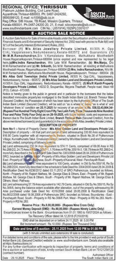 property: All that part and parcel of land admeasuring 330.60 Ares equivalent to 816.90 Cents together with all improvements thereon, situated in Block No.38 of Puthencruze Village Kunnathunadu Taluk. Emakulam District, owned by M's Atlas Golden Land and Developers Private Limited, comprising of following extents. (a) Land admeasuring 232.34 Ares equivalent to 574.11 Cents, comprised of 69.06 Ares in RS No.288/2/2, 24.73 Ares in RS No.305/7-1, 1.76 Ares in RS No.305/16-3, 136.79 Ares in RS.288/2-4, more fully described in the schedule of Sale Deed No. 3303/2008 dated 28.04.2008 of Puthencruze SRO, bounded as follows: North-Property of M's Allas Golden Land and Developers Private Ltd East-Property of Thomas Varghese. South-Property of Kavanal. West-Panchayath Road. (b) Land admeasuring 40.47 Ares equivalent to 100 Cents, situated. in Old Sy No.550/1/6, Re Sy No.288/2/2/4, more fully described in the schedule to Sale Deed No.3304/2008 dated 28.04.2008 & Rectification Deed No.6236/2012 dated 03.11.2012 of SRO Puthencruze, bounded as follows, North-Property of Mr. Rajesh Mathew, Mr. George Elias & Others. East-Property of Mr. Rajesh Mathew, Mr. George Elias & Others, South-Property of Mr. Rajesh Mathew, Mr. George Elias & Others. West Pathway (c) Land admeasuring 57.79 Ares equivalent to 142.79 Cents, situated in Old Sy No.550/15, Re Sy No.306/6, being the balance extent available after alienation, out of the property admeasuring 84 Ares purchased under Sale Deed No: 4316/2008 dated 29.05.2008 & Rectification Deed No.6632/2008 dated 18.08.2008 of Puthencruze SRO, bounded as follows; Boundaries - East-Panchayath Road. South Property in RS No.306/6 Part. West - Property in RS No.283. North-Property in RS No. 283.
