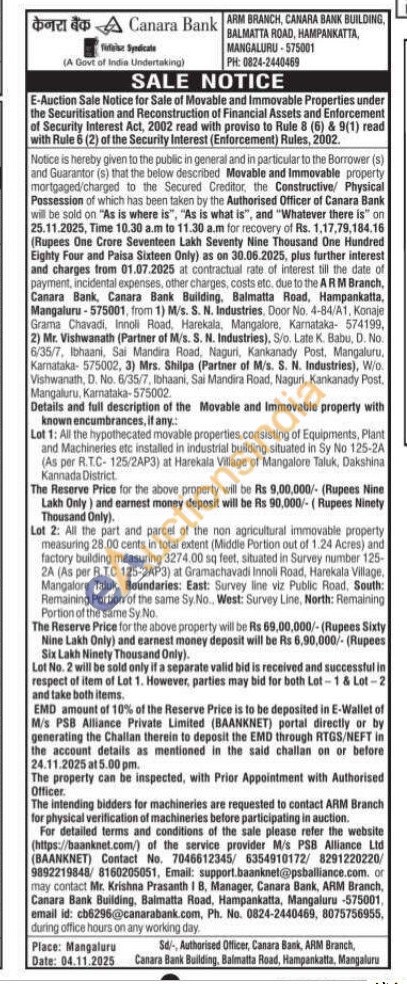 Lot 2: All the part and parcel of the non agricultural immovable property measuring 28.00 cents in total extent (Middle Portion out of 1.24 Acres) and factory building measuring 3274.00 sq feet, situated in Survey number 125-2A (As per R.TC 125-2AP3) at Gramachavadi Innoli Road, Harekala Village, Mangalore Taluk. Boundaries: East: Survey line viz Public Road, South: Remaining Portion of the same Sy.No., West: Survey Line, North: Remaining Portion of the same Sy No.