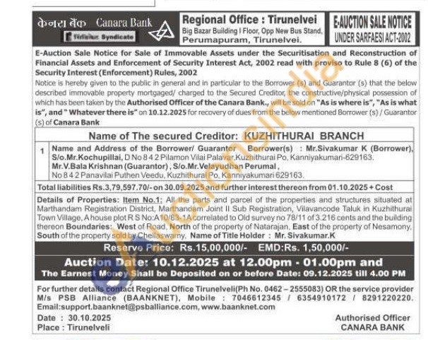 Details of Properties: Item No.1: All the parts and parcel of the properties and structures situated at Marthandam Registration District, Marthandam Joint II Sub Registration, Vilavancode Taluk in Kuzhithurai Town Village, A house plot RS No:A10/83-1A correlated to Old survey no 78/11 of 3.216 cents and the building thereon Boundaries: West of Road, North of the property of Natarajan, East of the property of Nesamony, South of the property sold by Chellaswamy, Name of Title Holder: Mr. Sivakumar.K