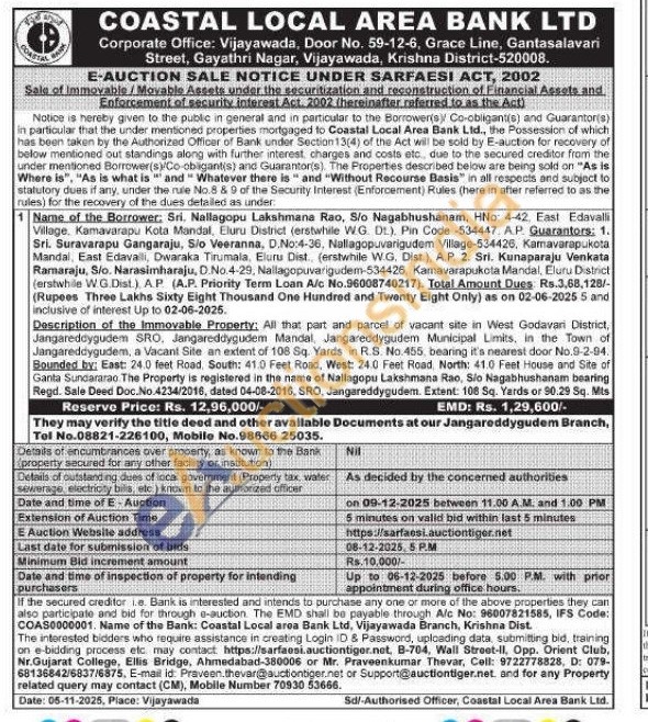 Description of the Immovable Property: All that part and parcel of vacant site in West Godavari District, Jangareddygudem SRO. Jangareddygudem Mandal, Jangareddygudem Municipal Limits, in the Town of Jangareddygudem, a Vacant Site an extent of 108 Sq. Yards in R.S. No.455, bearing it's nearest door No.9-2-94. Bounded by: East: 24.0 feet Road, South: 410 Feet Road, West: 24.0 Feet Road, North: 41.0 Feet House and Site of Ganta Sundararao. The Property is registered in the name of Nallagopu Lakshmana Rao, Sio Nagabhushanam bearing Regd. Sale Deed Doc.No.4234/2016, dated 04-08-2016, SRO, Jangareddygudem. Extent: 108 Sq. Yards or 90.29 Sq. Mits