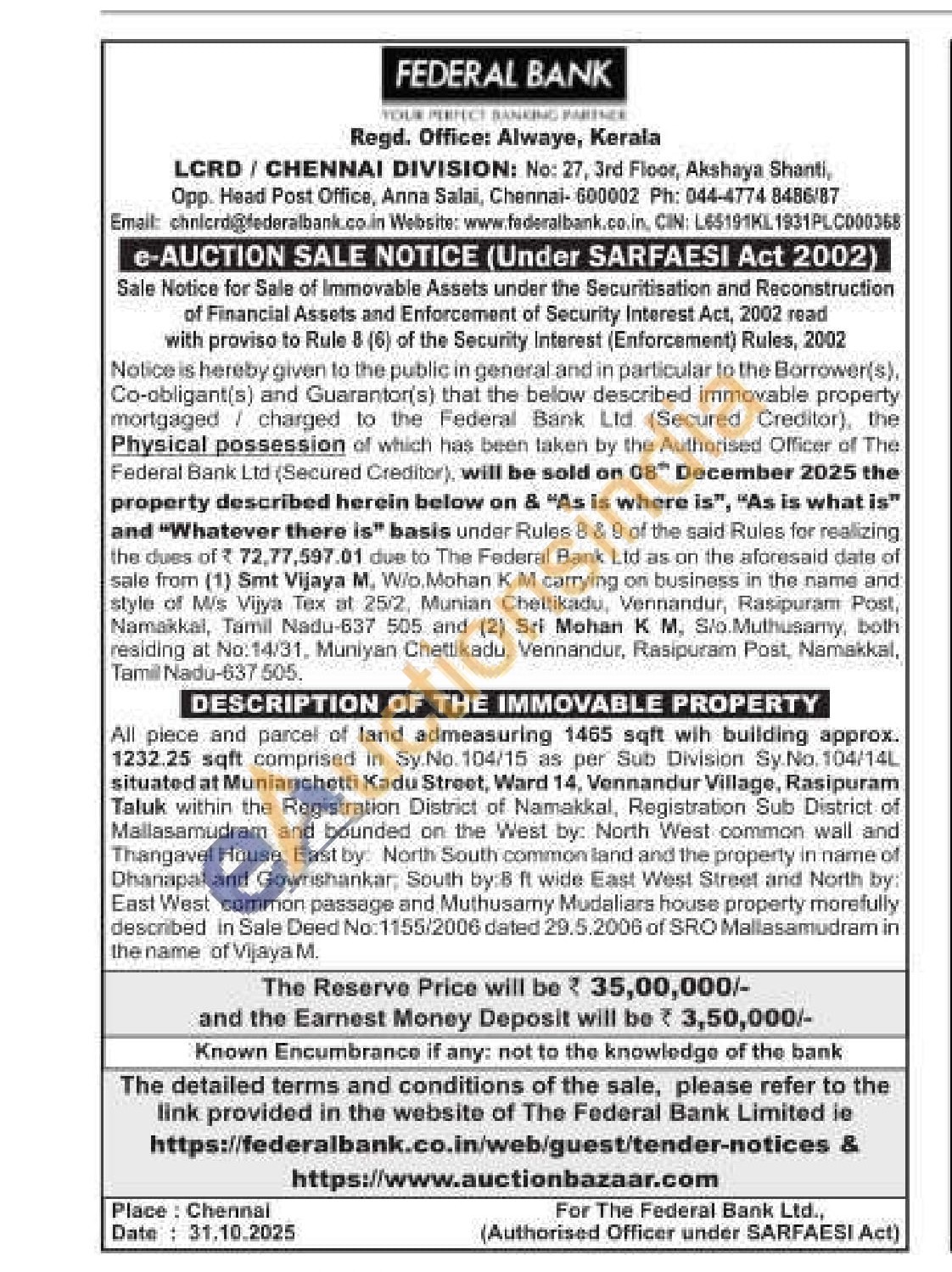 All piece and parcel of land admeasuring 1465 sqft wih building approx. 1232.25 sqft comprised in Sy.No. 104/15 as per Sub Division Sy.No. 104/14L situated at Munianchetti Kadu Street, Ward 14, Vennandur Village, Rasipuram Taluk within the Registration District of Namakkal, Registration Sub District of Mallasamudram and bounded on the West by: North West common wall and Thangavel House, East by: North South common land and the property in name of Dhanapal and Gowrishankar, South by:B ft wide East West Street and North by: East West common passage and Muthusamy Mudaliars house property morefully described in Sale Deed No:1155/2006 dated 29.5.2006 of SRO Mallasamudram in the name of Vijaya M.