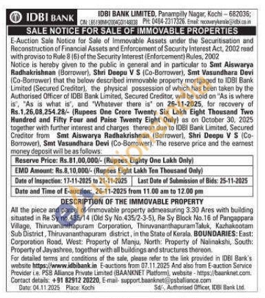All the piece and parcel of immovable property admeasuring 3.30 Ares with building situated in Re Sy no.435/14 (Old Sy No. 435/2-3-5), Re Sy Block No.16 of Pangappara Village, Thiruvananthapuram Corporation, Thiruvananthapuram Taluk, Kazhakootam Sub District, Thiruvananthapuram district, in the State of Kerala, BOUNDARIES: East: Corporation Road, West: Property of Manju, North: Property of Nalinakshi, South: Property of Jayashree, together with all buildings and structures thereon