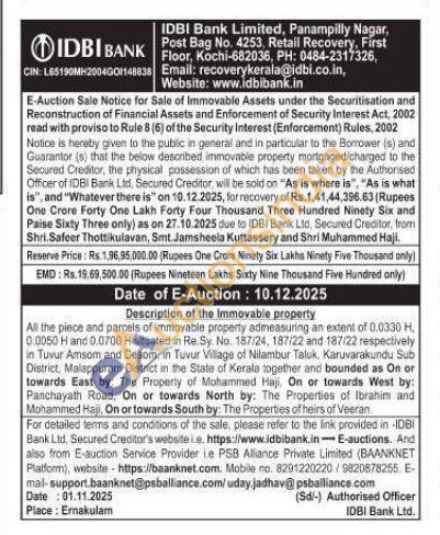 All the piece and parcels of immovable property admeasuring an extent of 0.0330 H. 0.0050 H and 0.0700 H situated in Re Sy. No. 187/24, 187/22 and 187/22 respectively in Tuvur Amsom and Desom, in Tuvur Village of Nilambur Taluk, Karuvarakundu Sub District, Malappuram District in the State of Kerala together and bounded as On or towards East by: The Property of Mohammed Haji. On or towards West by: Panchayath Road, On or towards North by: The Properties of Ibrahim and Mohammed Haji, On or towards South by: The Properties of heirs of Veeran
