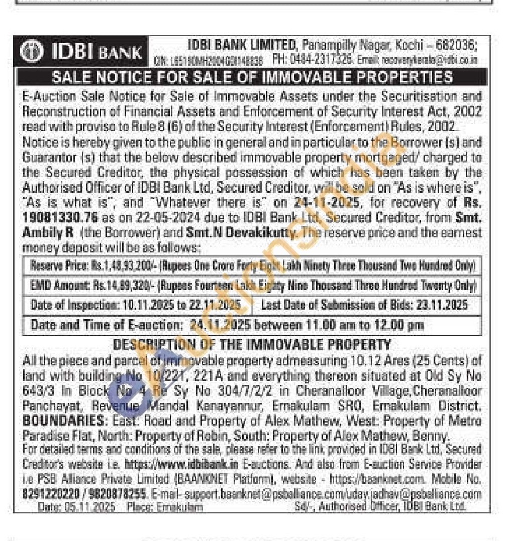 All the piece and parcel of immovable property admeasuring 10.12 Ares (25 Cents) of land with building No 10/221, 221A and everything thereon situated at Old Sy No 643/3 In Block No 4 Re Sy No 304/7/2/2 in Cheranalloor Village, Cheranalloor Panchayat, Revenue Mandal Kanayannur, Ernakulam SRO, Ernakulam District BOUNDARIES: East: Road and Property of Alex Mathew, West: Property of Metro Paradise Flat, North: Property of Robin, South: Property of Alex Mathew, Benny.
