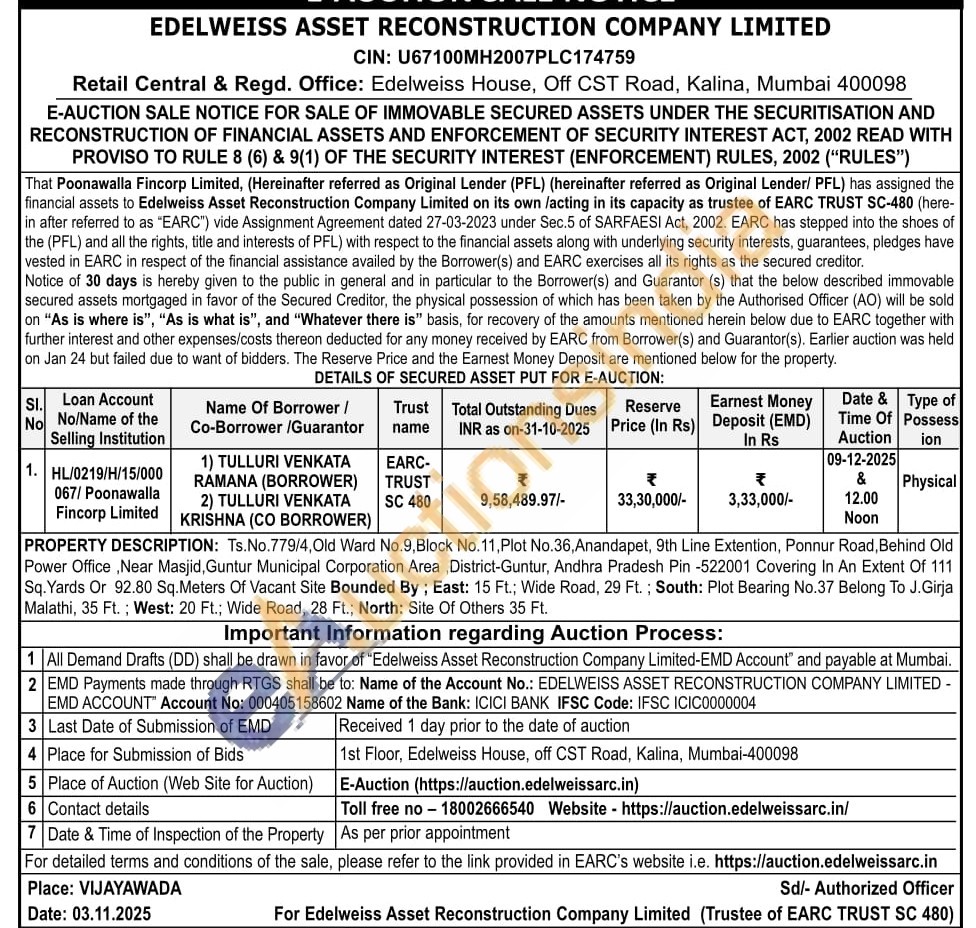 PROPERTY DESCRIPTION: Ts. No.779/4, Old Ward No.9, Block No. 11, Plot No.36, Anandapet, 9th Line Extention, Ponnur Road, Behind Old Power Office Near Masjid, Guntur Municipal Corporation Area, District-Guntur, Andhra Pradesh Pin -522001 Covering In An Extent Of 111 Sq. Yards Or 92.80 Sq.Meters Of Vacant Site Bounded By; East: 15 Ft.; Wide Road, 29 Ft.; South: Plot Bearing No.37 Belong To J.Girja Malathi, 35 Ft.; West: 20 Ft.; Wide Road, 28 Ft.; North: Site Of Others 35 Ft.