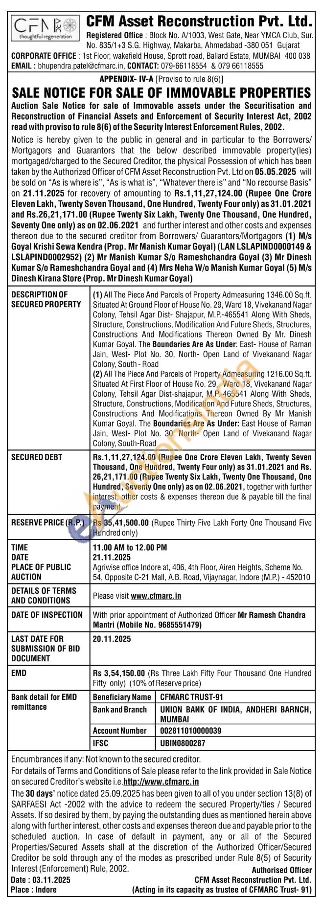 (1) All The Piece And Parcels of Property Admeasuring 1345.00 Sq.ft. Situated At Ground Floor of House No. 29, Ward 18, Vivekanand Nagar Colony, Tehsil Agar Dist- Shajapur, M.P-465541 Along With Sheds. Structure, Constructions, Modification And Future Sheds, Structures, Constructions And Modifications Thereon Owned By Mr. Dinesh Kumar Goyal. The Boundaries Are As Under: East- House of Raman Jain, West- Plot No. 30. North Open Land of Vivekanand Nagar Colony, South Road(2) All The Piece And Parcels of Property Admeasuring 1216.00 Sq.ft. Situated At First Floor of House No. 29, Ward 18, Vivekanand Nagar Colony, Tehsil Agar Dist-shajapur, M.P.-465541 Along With Sheds. Structure, Constructions, Modification And Future Sheds, Structures, Constructions And Modifications Thereon Owned By Mr Manish Kumar Goyal, The Boundaries Are As Under: East House of Raman Jain, West- Plot No. 30, North Open Land of Vivekanand Nagar Colony, South-Road