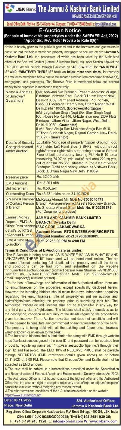 Equitable Mortgage of property "Upper Ground Floor, Front side, Left Hand Side (3 BHK) without its roof rights/terrace rights with car parking space at Ground Floor of built up property, bearing Plot No B-10, area measuring 74.07 sq. yds, out of total area 222 sq yds, out of Khasra No 358, situated in the area of village Bindapur, Delhi and colony known as Vishwas Park, Block B, Uttam Nagar New Delhi 110059.