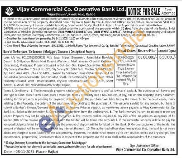 Loa Property Situated in Dist. Sub. Dist. Rajkot, Survey No. 374 Paiki, City Survey Ward No. 7, Sheet No. 323, City Survey No. 5046 Paiki, Plot No. 3, Sub Plot No. 3/C Land Area Adm. 73-47 50. Mtrs, Owned by Shilpaben Rakeshbhai Dasani and its bounded as per under North: Road Situated, South Other Property Situated East: Other Property Sitsated, West: Road Situated, Physical Possession Date: 10-10-2025, Short Addres: 6-Mavdi Plot, Near Ambika Way Bridge, Rajkot