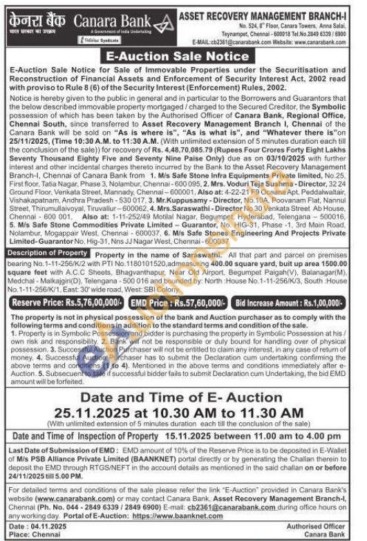 All that part and parcel on premises bearing No. 1-11-256/K/2 with PTI No. 1180101520, admeasuring 400.00 square yard, buit up area 1500.00 square feet with A.C.C Sheets, Bhagvanthapur, Near Old Airport, Begumpet Paigah(V), Balanagar(M), Medchal-Malkajgiri(D), Telengana-500 016 and bounded by: North House No.1-11-256/K/3, South House No. 1-11-256/K/1, East: 30' wide road, West: SBI Colony