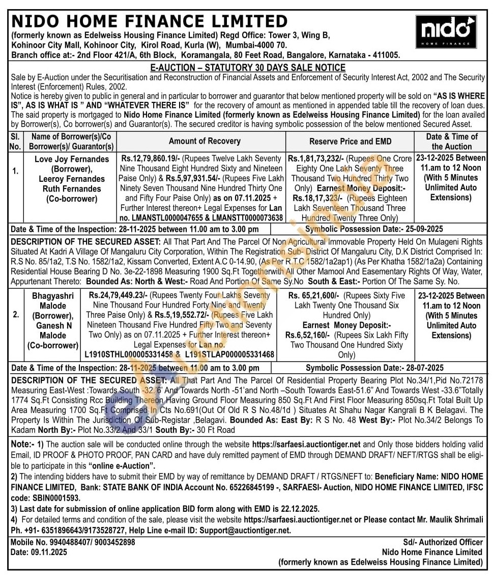DESCRIPTION OF THE SECURED ASSET: All That Part And The Parcel Of Residential Property Bearing Plot No.34/1, Pid No.72178 Measuring East-West: Towards South -32.'6' And Towards North -51'and North-South Towards East-51.6" And Towards West -33.6" Totally 1774 Sq.Ft Consisting Rcc Building Thereon Having Ground Floor Measuring 850 Sq.Ft And First Floor Measuring 850sq.Ft Total Built Up Area Measuring 1700 Sq.Ft Comprised In Cts No.691 (Out Of Old R S No.48/1d) Situates At Shahu Nagar Kangrali B K Belagavi. The Property Is Within The Jurisdiction Of Sub-Registar, Belagavi. Bounded As: East By: R S No. 48 West By:- Plot No.34/2 Belongs To Kadam North By:- Plot No.33/2 And 33/1 South By:- 30 Ft Road